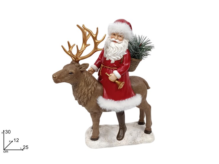 أضف دفء وعجائب الكريسماس إلى منزلك مع هذا التمثال المفصل بشكل جميل لبابا نويل وهو يمتطي حيوان الرنة. صنعت هذه القطعة الاحتفالية من الراتنج المتين، وتتميز هذه القطعة الاحتفالية بسانتا بمعطفه الأحمر التقليدي مع زخرفة بيضاء ناعمة وهو يحمل جرسًا ذهبيًا ويجلس بفخر فوق حيوان الرنة بقرون ذهبية. وعلى ظهره سلة صغيرة مليئة بنباتات الصنوبر الخضراء تضفي لمسة شتوية طبيعية.