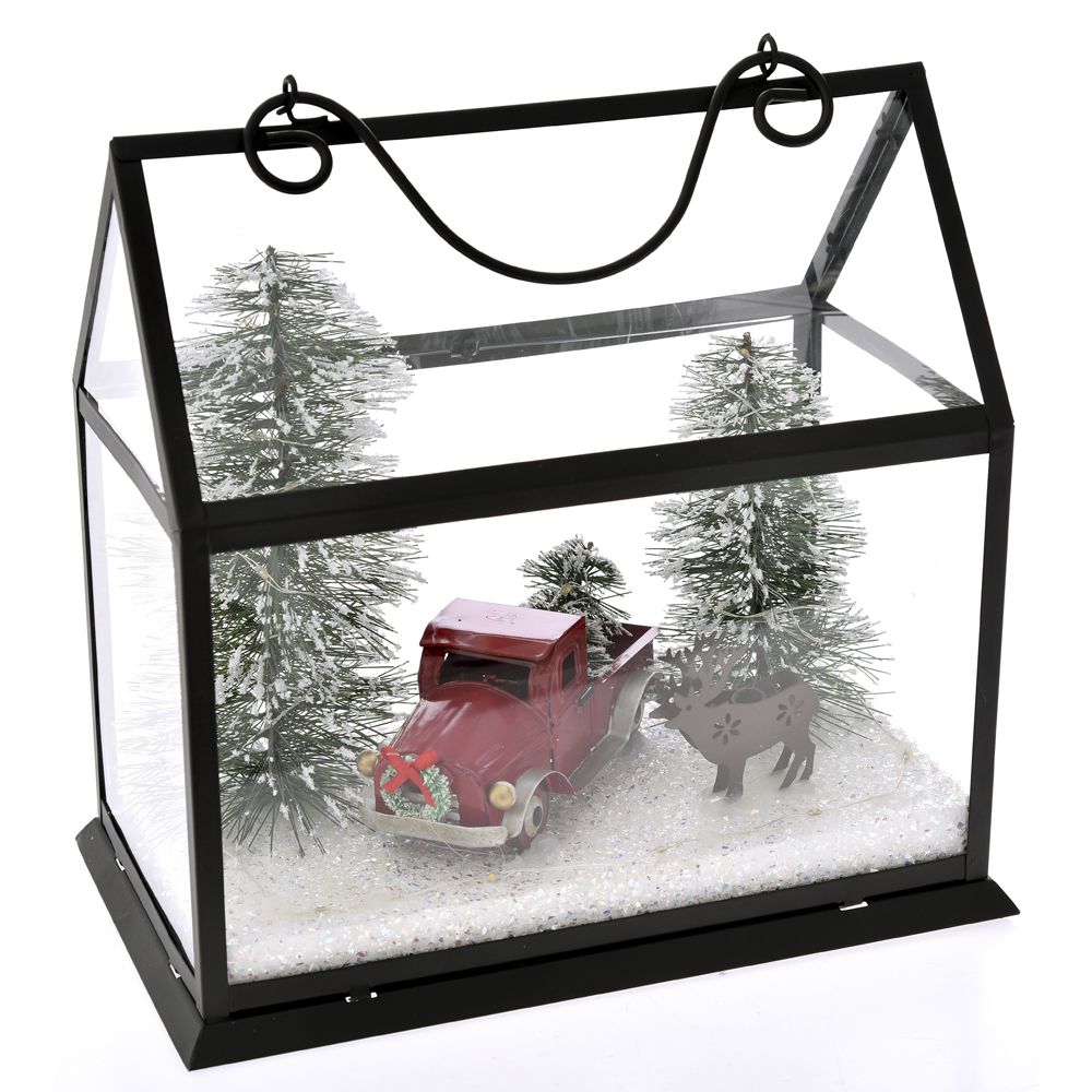 فانوس الكريسماس على شكل منزل مع سيارة حمراء وشجرة في الداخل