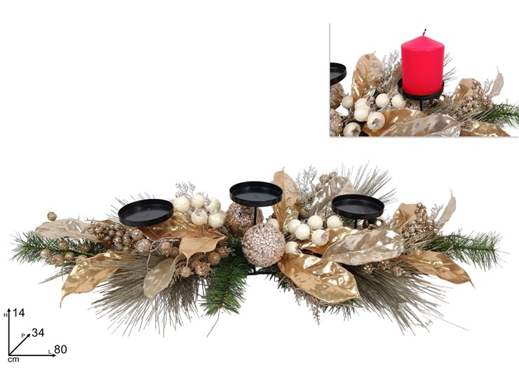 أضف لمسة من السحر الاحتفالي إلى طاولة عطلتك مع هذه القطعة المركزية الفاخرة لعيد الميلاد. تم تصميم هذه القطعة بمزيج غني من الأوراق الذهبية والزخارف المتلألئة ولمسات الصنوبر الطبيعية، وتتميز بثلاثة حاملات شموع مرتفعة لعرض الشموع العمودية بشكل جميل.