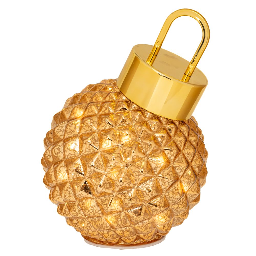 أضف توهجًا ساحرًا إلى مساحتك مع هذا الفانوس الفريد من نوعه على شكل زينة. مصنوع من الزجاج الذهبي المزخرف مع سطح علوي ذهبي لامع يجمع بين سحر الأعياد الكلاسيكي والأناقة العصرية. تُضفي أضواء LED الناعمة بالداخل توهجًا مريحًا ومحيطًا – مثالي للرفوف أو الأرفف أو كقطعة مركزية على الطاولة.
