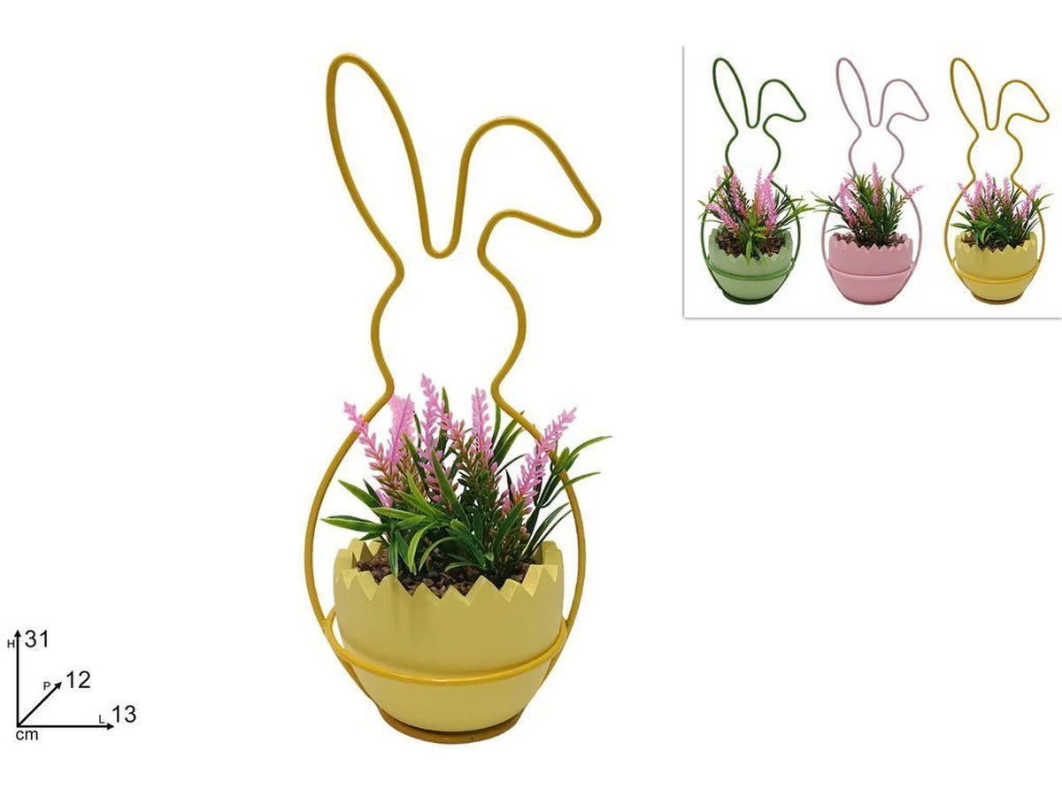 העיצוב: פסל של ארנב אוחז ביצה וצמח קטן, שנותן אווירה אביבית וחגיגית