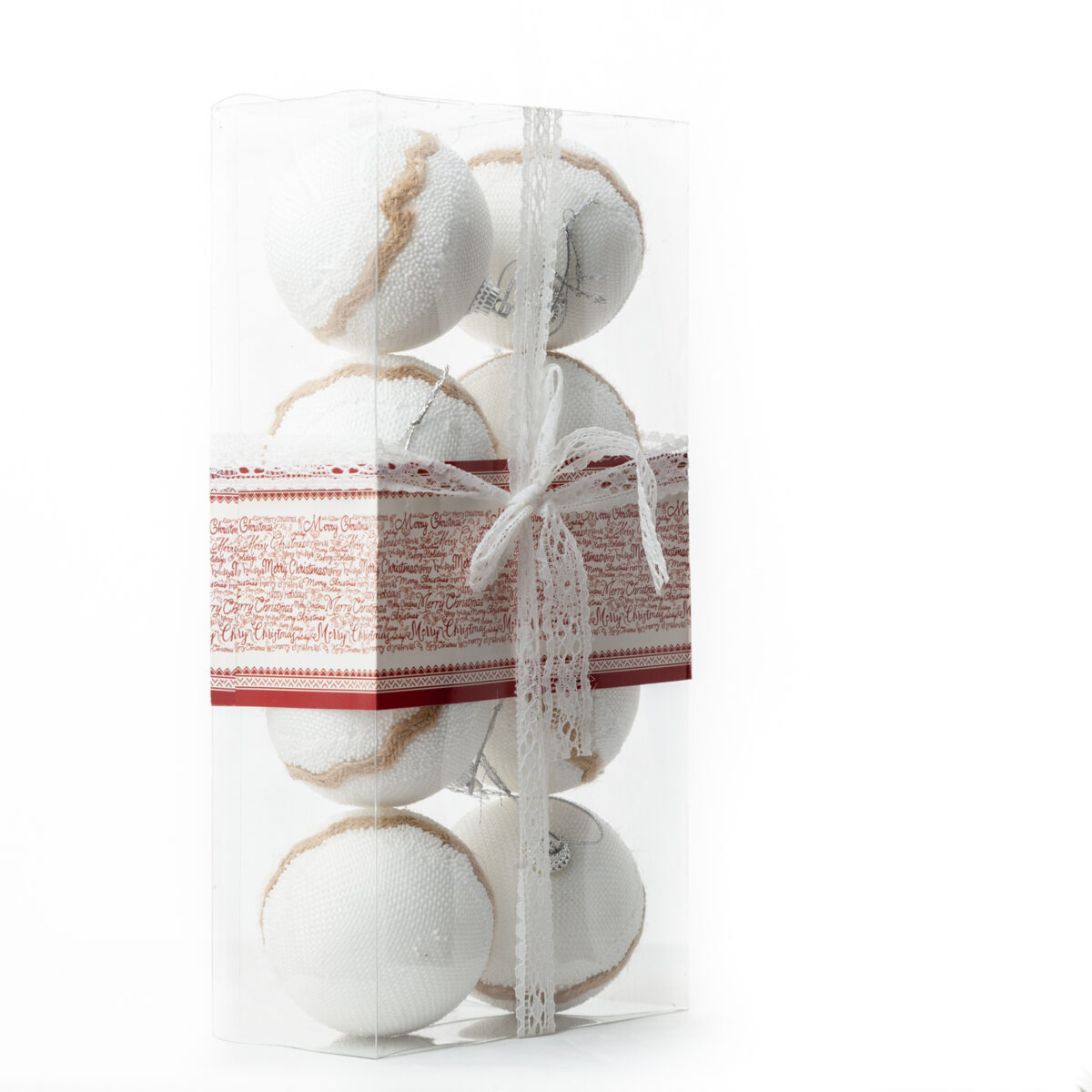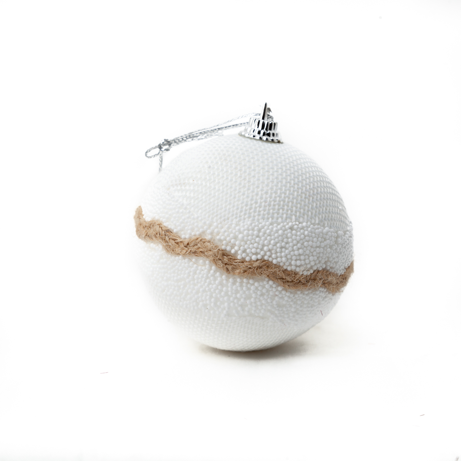 כדור בד לבן מעורב עם חבל בד יוטה מרכזי וגלי ונקודות קלקר קטנטנות, קישוט מקסים ואיכותי המגיע בקטרים וחבילות שונות. קישוטים מיוחדים לקישוט עץ חג המולד שלך.
