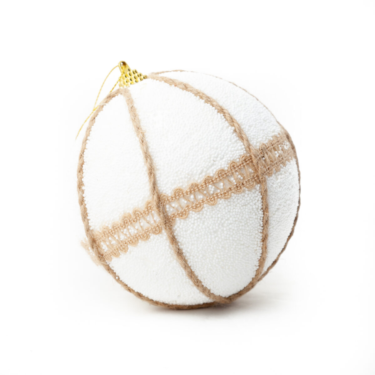 כדור נקודות קלקר לבן זעיר ומרתק עם פס בד יוטה רחב וחבלים אנכיים, מה שמוסיף קסם לעץ חג המולד שלך.