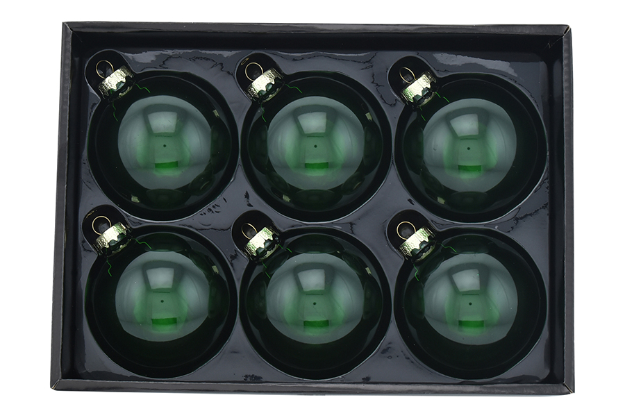 סט אלגנטי של שישה קישוטי זכוכית בצבע ירוק כהה, כל אחד עם גימור חלק. ארוזים במגש פלסטיק שקוף, מוכנים לתלייה על העץ או כמתנה כסט חגיגי.