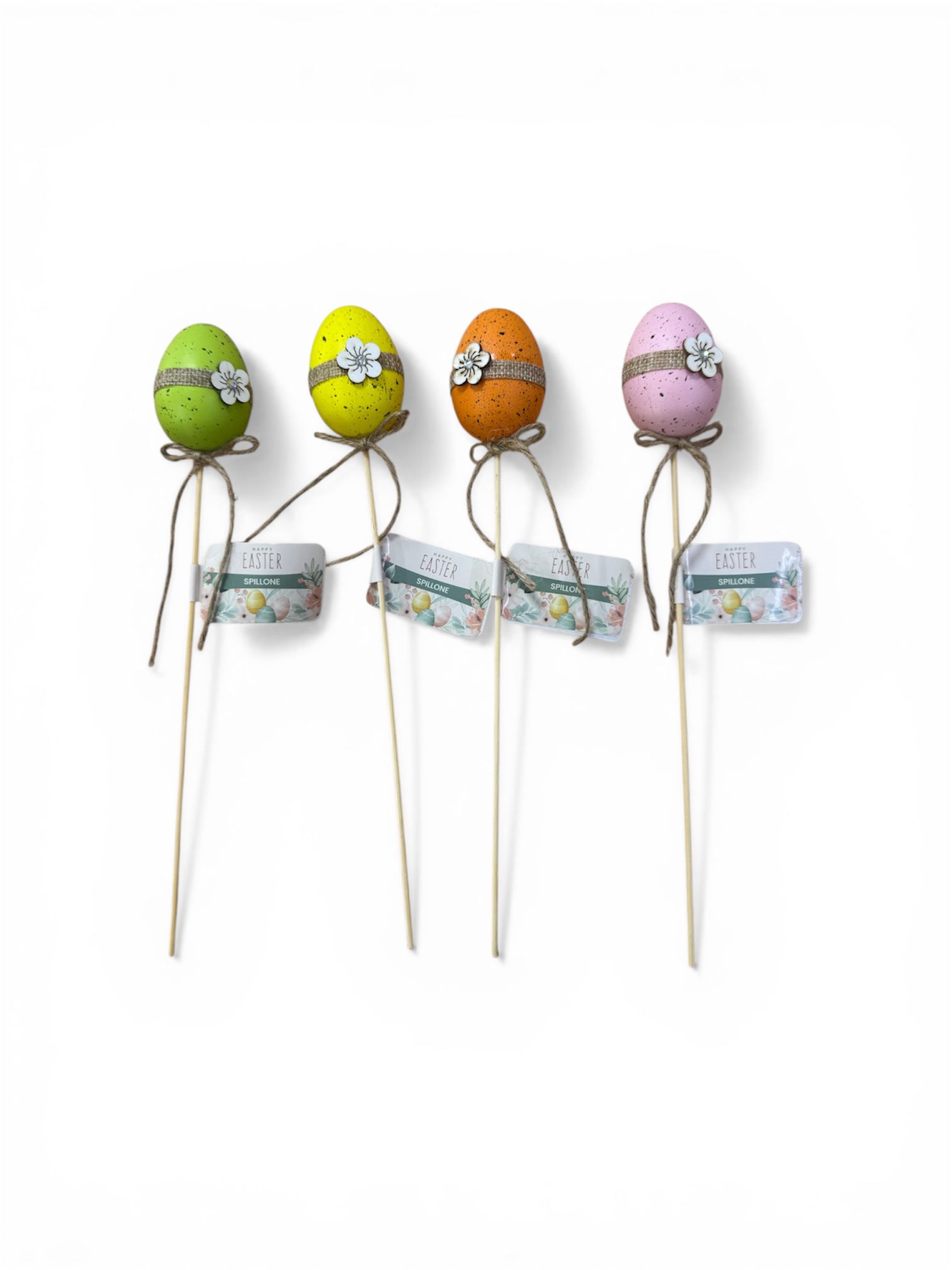 This playful Easter egg pick features a colorful egg character with thin decorative legs mounted on a wooden stick. Designed in cheerful spring colors with cute facial details, it adds a fun and lively touch to Easter displays.