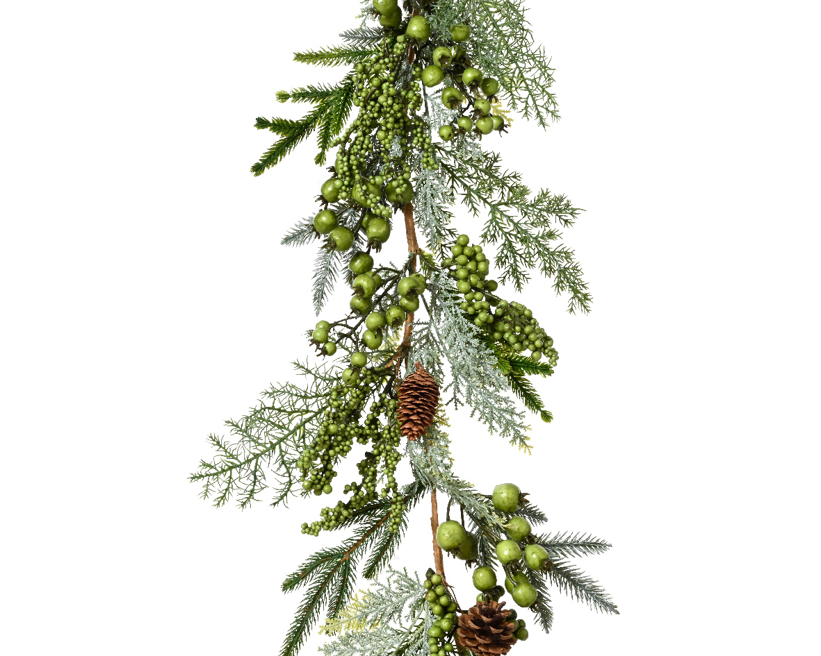 Frosted Winter Garland – Green Berries, Pinecones & Evergreen Foliage