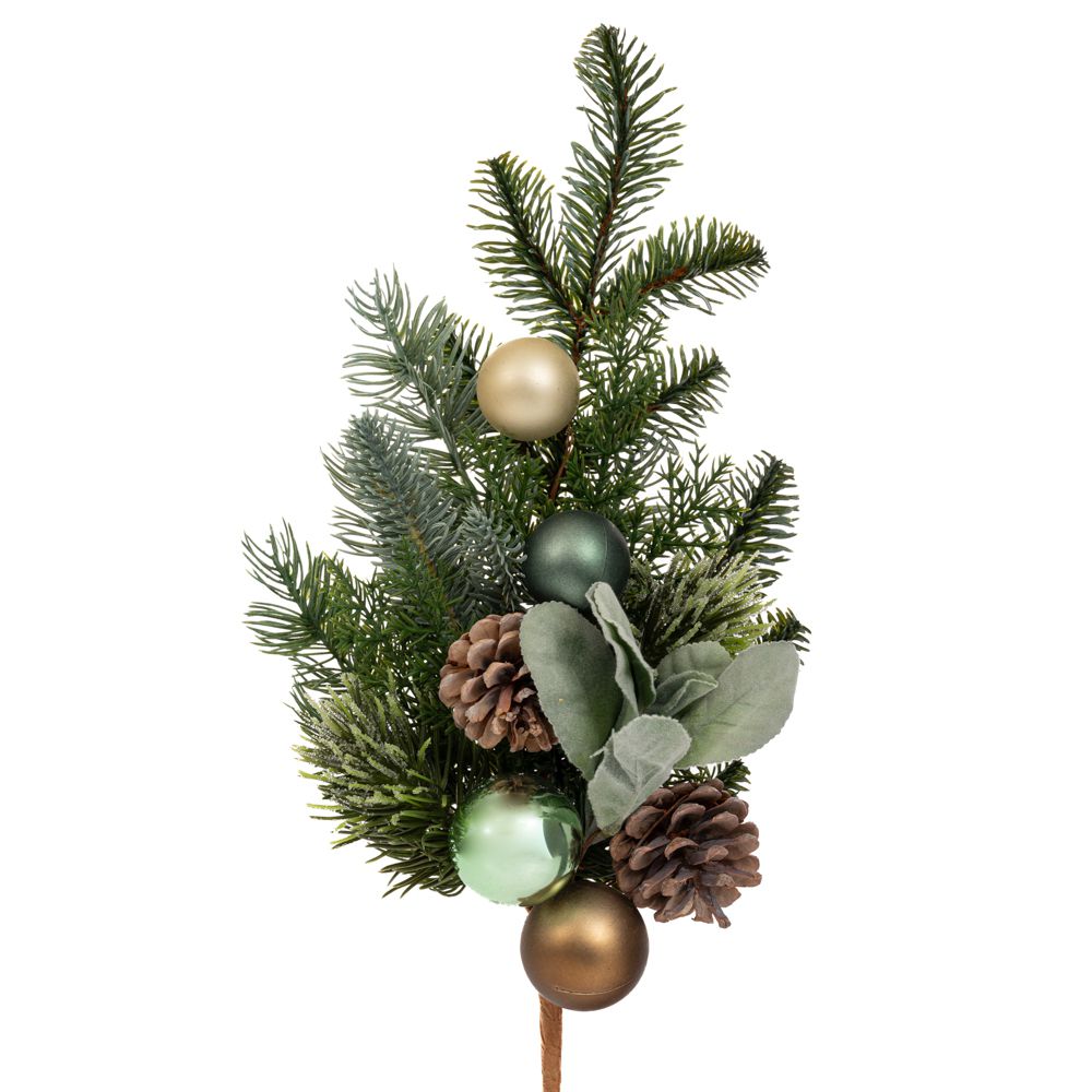 Add a touch of timeless charm to your holiday decor with this beautiful pine pick. Featuring realistic evergreen branches, frosted pinecones, and a subtle mix of gold, bronze, and matte green ornaments, this piece brings together the earthy beauty of winter with a hint of festive elegance.