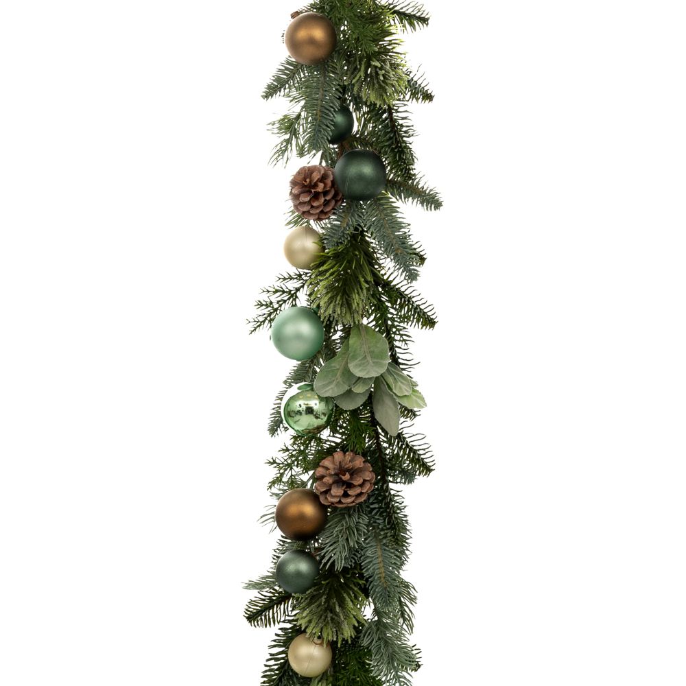 Wrap your home in the natural beauty of the season with this stunning green garland. Adorned with a mix of matte and glossy ornaments in soft green, gold, and bronze tones, along with real-touch pine needles, pinecones, and velvety leaves—this garland adds a sophisticated forest-inspired charm to any space.