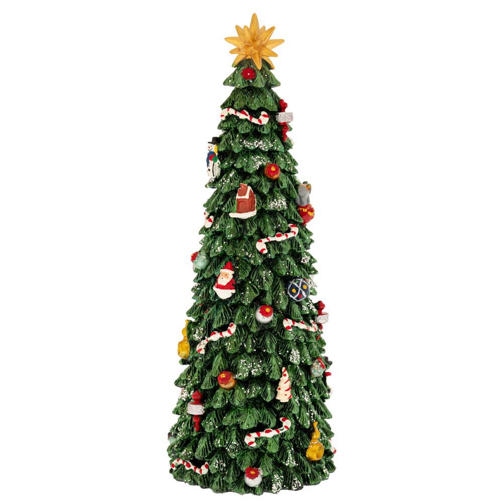 Bring the holiday magic to life with this charming green polyresin Christmas tree! Adorned with tiny festive ornaments and a glowing golden star on top, this delightful piece lights up, plays music, and even features gentle movement – making it the perfect centerpiece for your holiday décor.