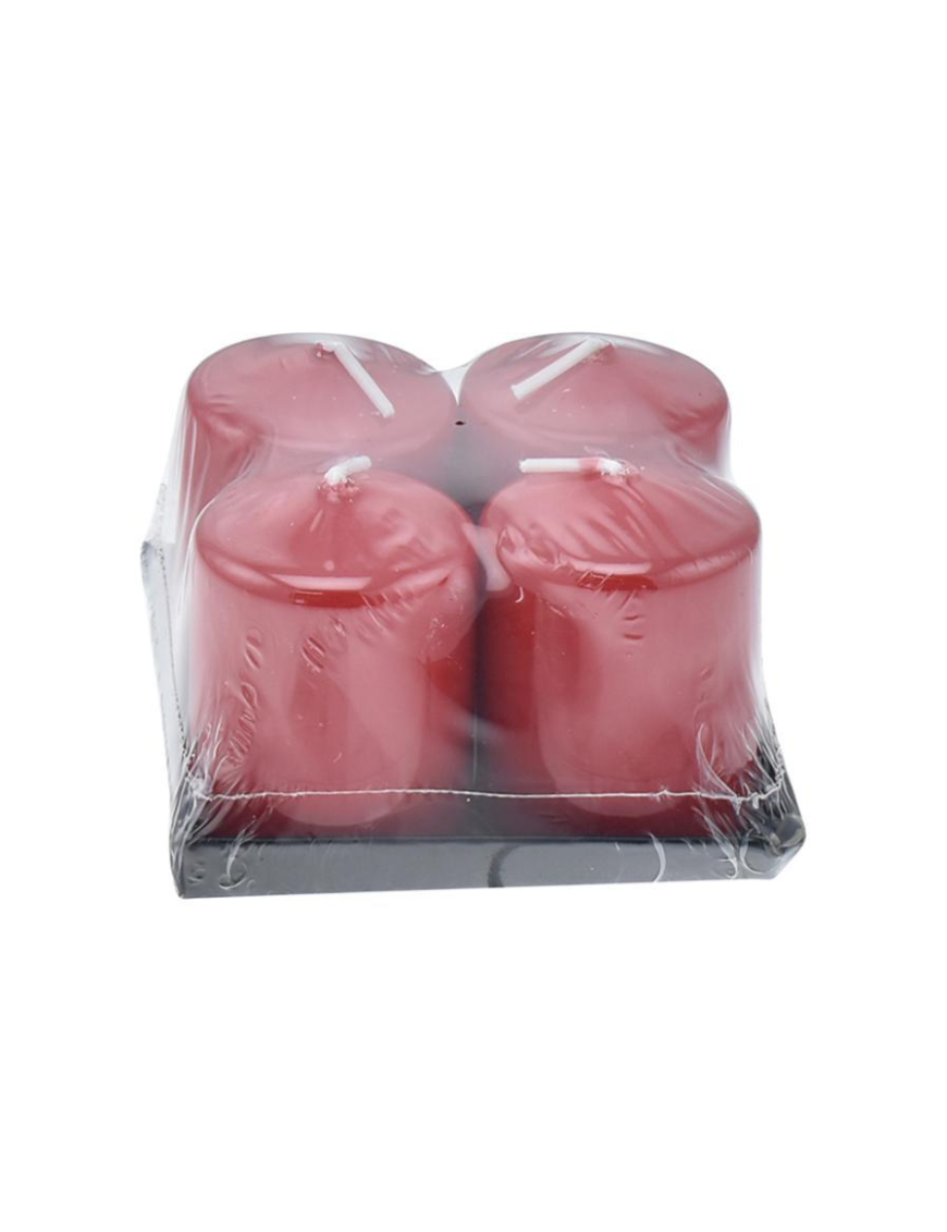 Small glossy red pillar candles in a set of four. These lacquer-finished candles are elegant and timeless, suitable for candle holders, mantels, or dinner tables.