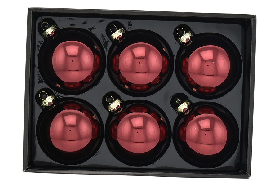 Elegant 6-piece set of 8cm diameter glass baubles in bordeaux red, featuring a lacquered glossy finish. Perfect for a sophisticated tree setup.
