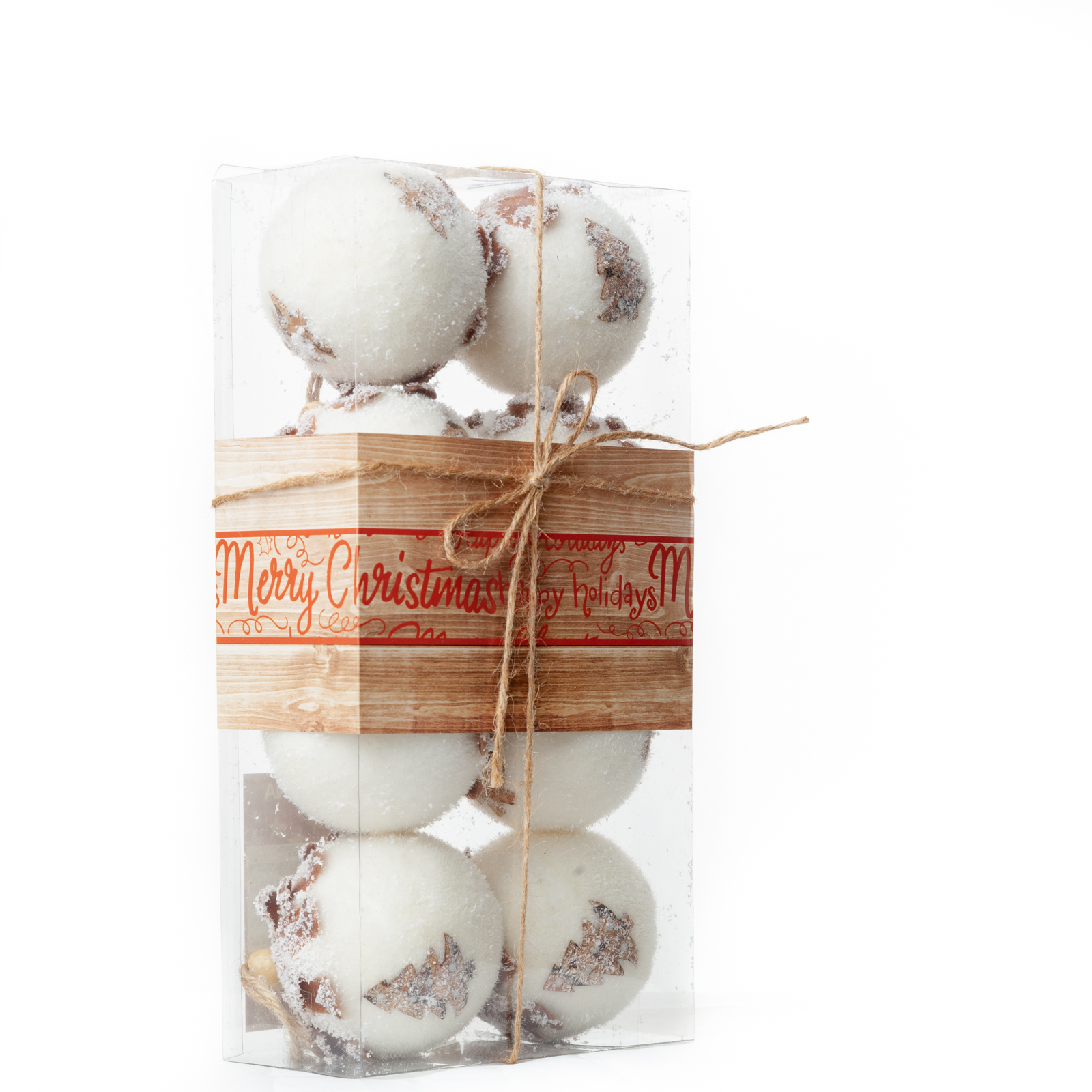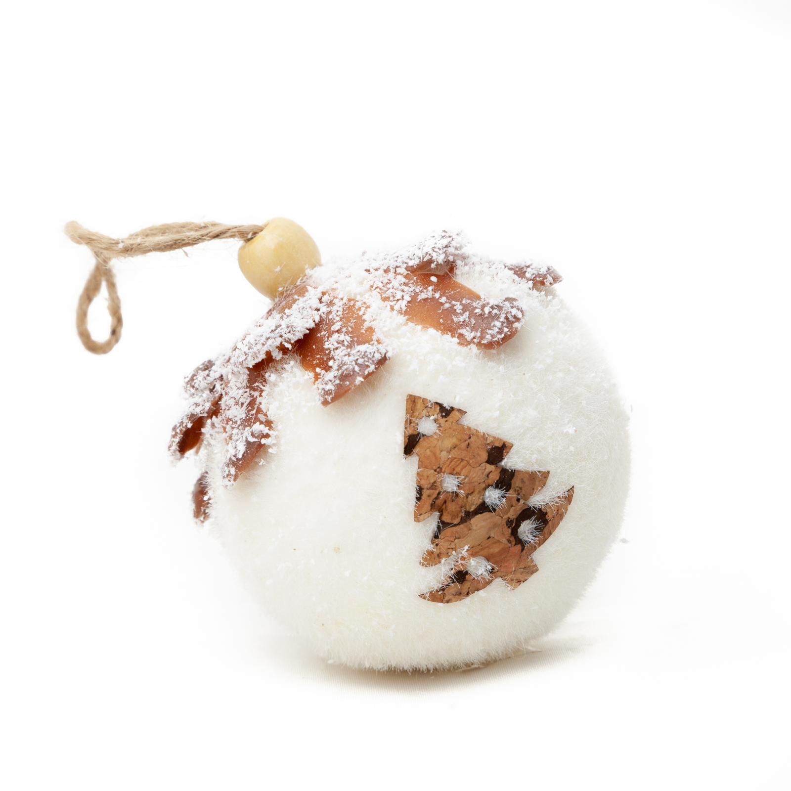 A delightful white velvet ball with wooden cork trees and pine cone top, unparalleled addition to your Christmas tree. High quality ornament with different diameters and packages available.